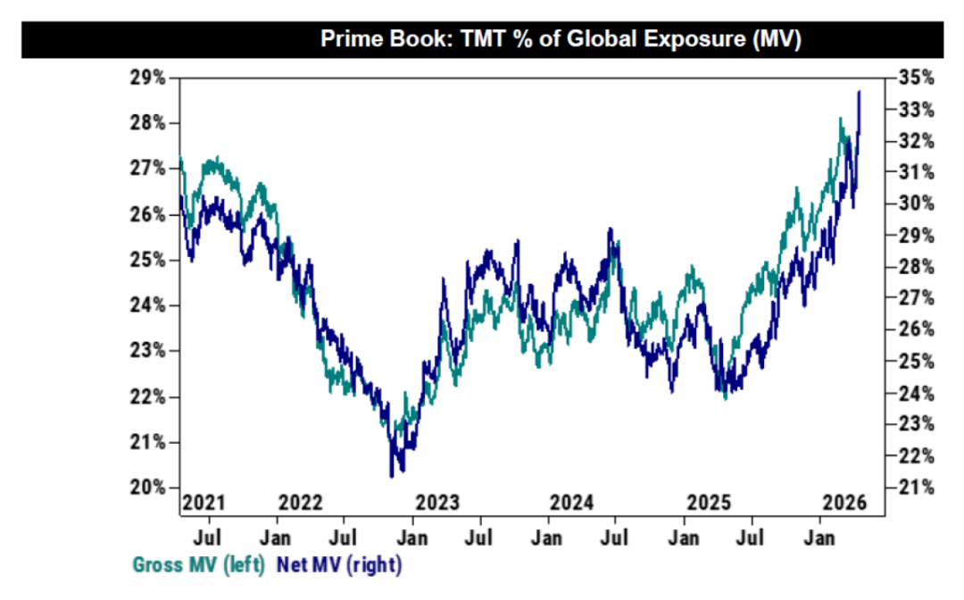 4、不过高盛的主经纪商(PB)数据也显示,全球TMT(信息技术 + 通信服务)板块是上周净买入规模最大的行业,且各大主要地区均出现买入行为。这一轮买入主要由多头建仓驱动,而非仅仅是空头回补,表明存在真实的买需,而不仅仅是被迫去杠杆。值得注意的是:信息技术板块在连续5周净卖出后,首次转为净买入,其中半导体、电子设备和软件子板块领涨;通信服务板块则录得近5个月来最大比例的净买入。目前,TMT板块在全球主经纪商业务账簿中的总敞口和净敞口分别达到28.3%和34.0%,均为五年高位。