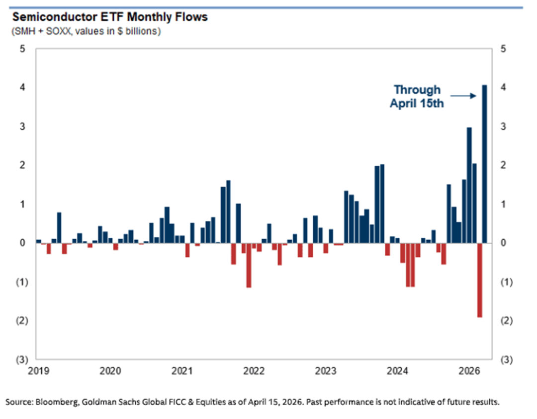 5、ETF层面也观察到类似现象:SMH(半导体ETF)与SOXX(半导体ETF)正朝着有史以来最大的单月合计资金流入迈进,截至4月仅半个月时间,这两只基金的合计净流入额已达到40亿美元。而等权重标普500 ETF(RSP)则正经历约20年来最严重的月度赎回潮。总体而言,近期的主题是投资者对更高集中度的需求——更少等权重配置,更多AI/半导体/超大市值科技股。