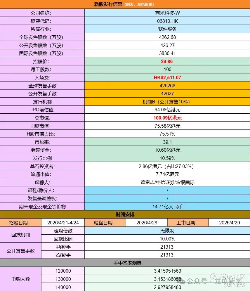 本次全球发售股数4262.68万股,每手股数100股,招股价24.86港元,入场费2511.07港元,采用机制B发行,公开发售手数42627手,预计12-14万人参与,一手中签率3%左右,申购1000手稳一手。