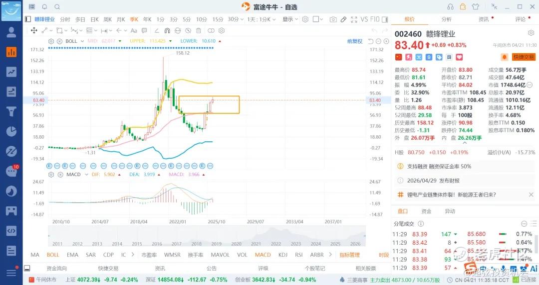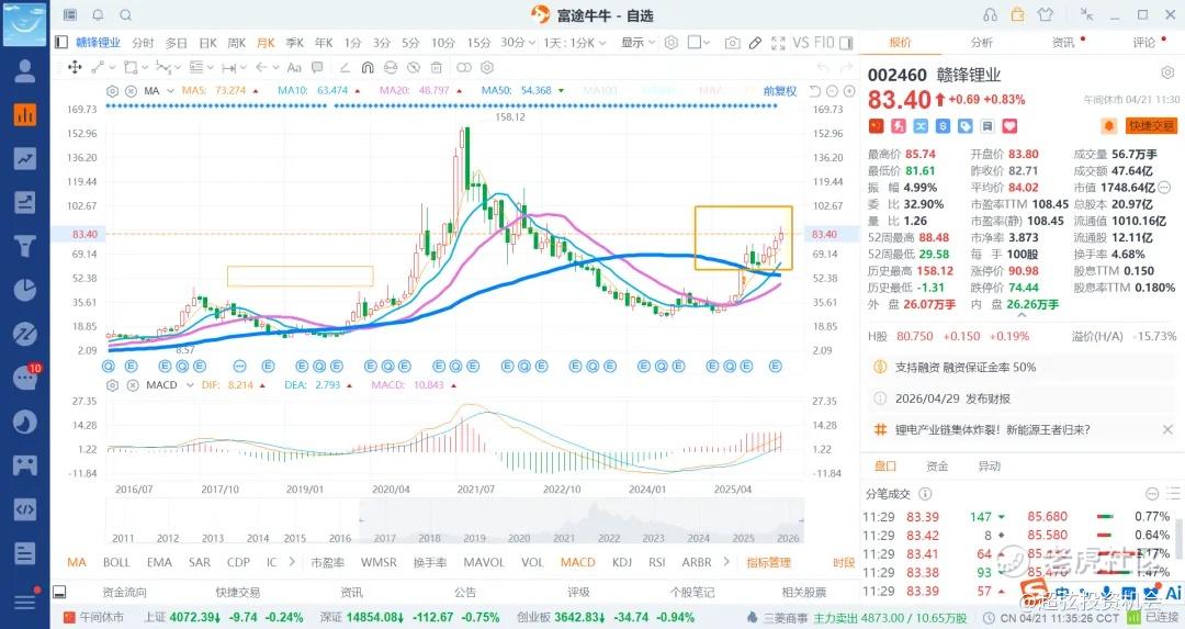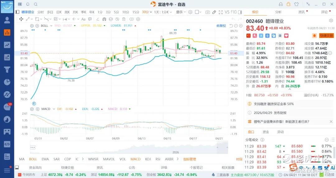 赣锋锂业基本80/65就是铁底部了,高位压制暂时在90/100附近吧,后续120/150看情况了,预计第一季度业绩还不错,看看天齐锂业就知道了,反而后续走高的小心谨慎,走低反而是给机会了,所以赣锋的低吸,而不是追高了,可以间隔大概1.5-2快左右左t差价了,大的也不要超过3-5快,不然就网格不到了。