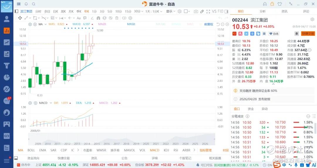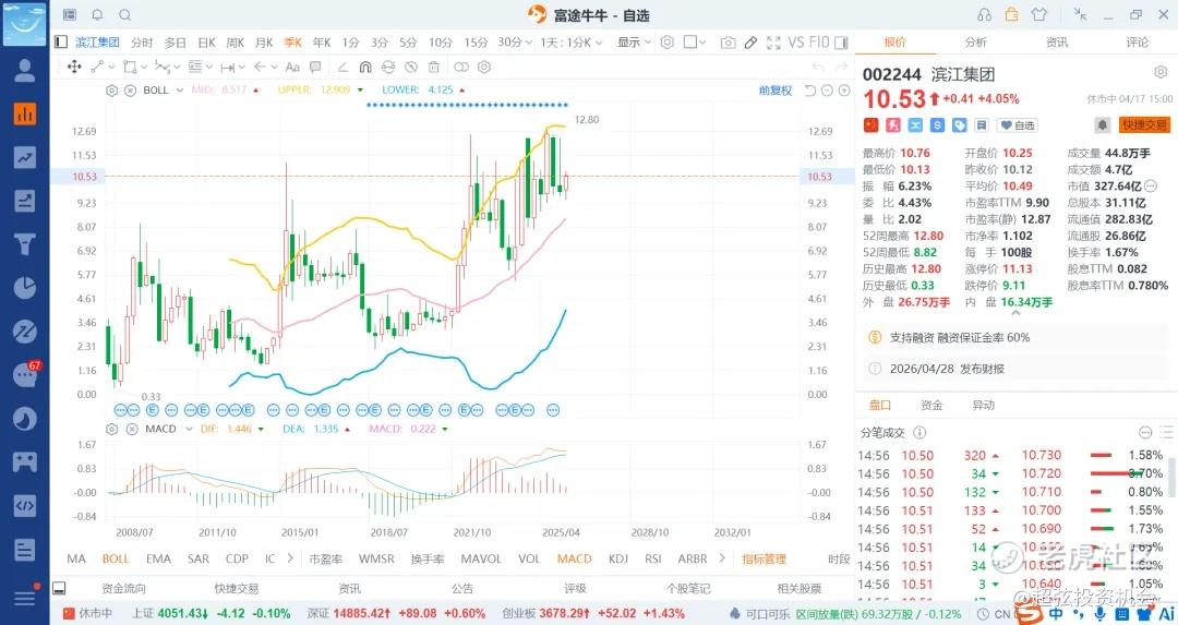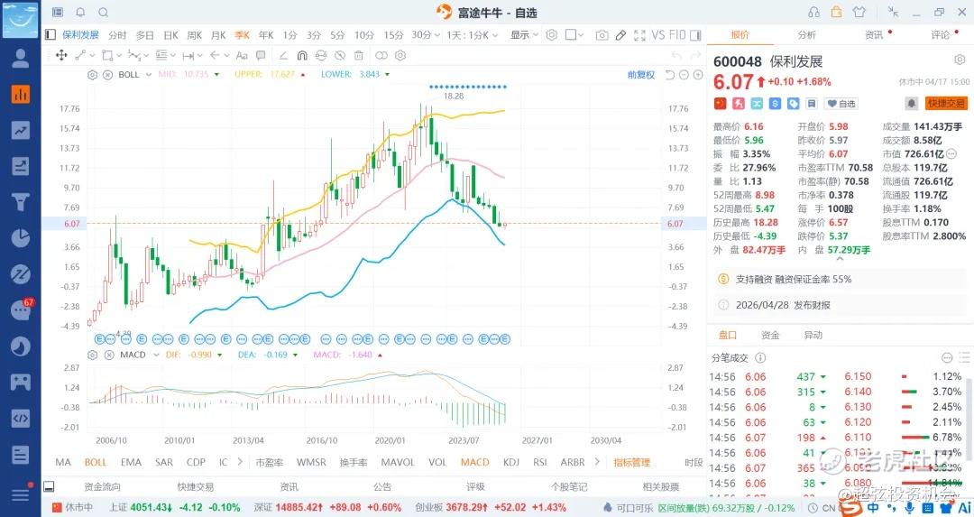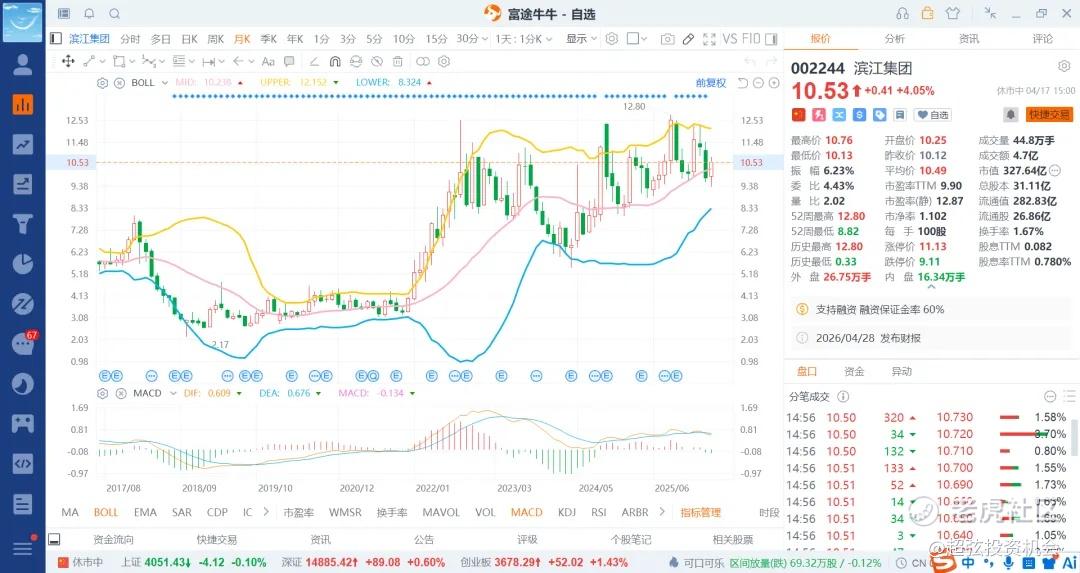 比较优秀的还是没什么负债优质本地滨江集团,要是一直玩也不差劲了,每次跌到月boll带中轨往下买到下轨就差不多了,走高到上轨就逐步吃肉,就是靠这样的差价来获利了,后续在8.5-6.5才是好位置,未来看到最少12.5附近,好点是14-15左右吧,折算下来3-5年大概是10-18%附近也还行。