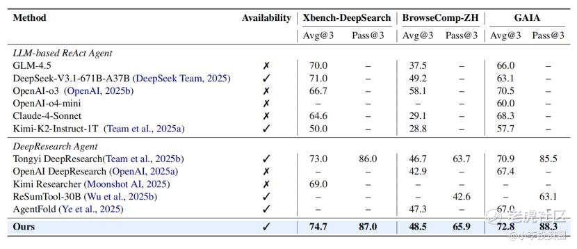 技术架构的精妙设计,最终转化为了实打实的性能跃升。在三大国际基准测试集中,“认知支架”技术均表现优异。以 BrowseComp-ZH 数据集为例,该技术的 Pass@3 指标达到了 65.9%,相比传统基于总结的方法,准确率大幅提升了 23.3%。
