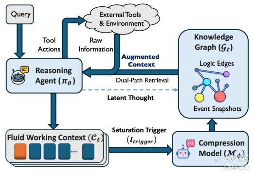 具体而言,该架构实现了长短期记忆分离。它将智能体的认知状态解耦为负责即时推理的“流动工作上下文”,以及负责长期存储的“持久知识图谱”,两者互不干扰又协同工作。