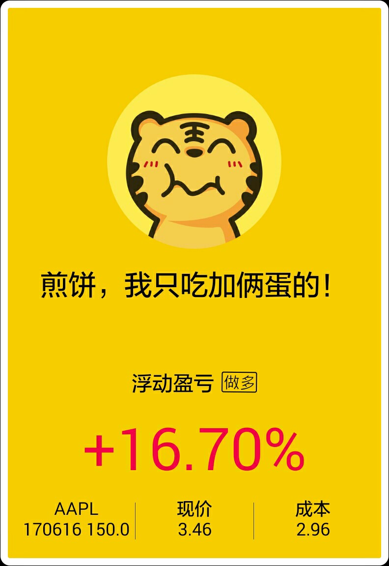 $AAPL 20170616 150.0 CALL(AAPL)$ 虽然苹果快要回调了,的是在回调之前捞一笔也是可以的