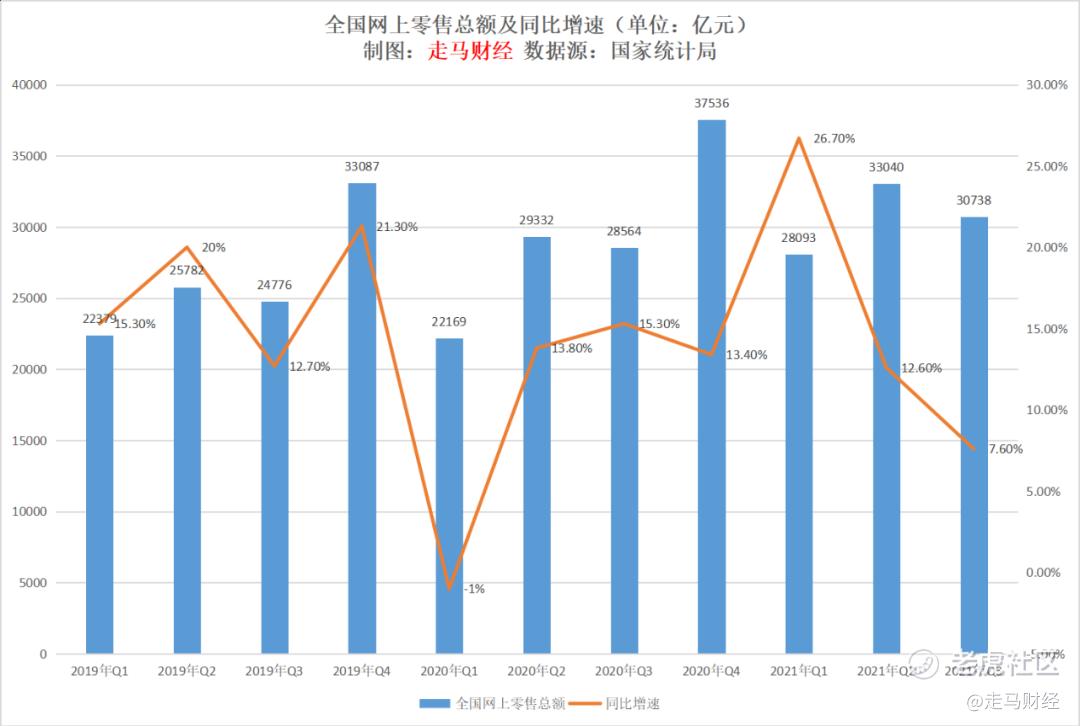 再看看最近11个季度全国网上零售总额和他的同比增长情况,三季度的同比增速已经下降到了个位数的7.6%,前三季度同比增速也仅仅增长18.5%。