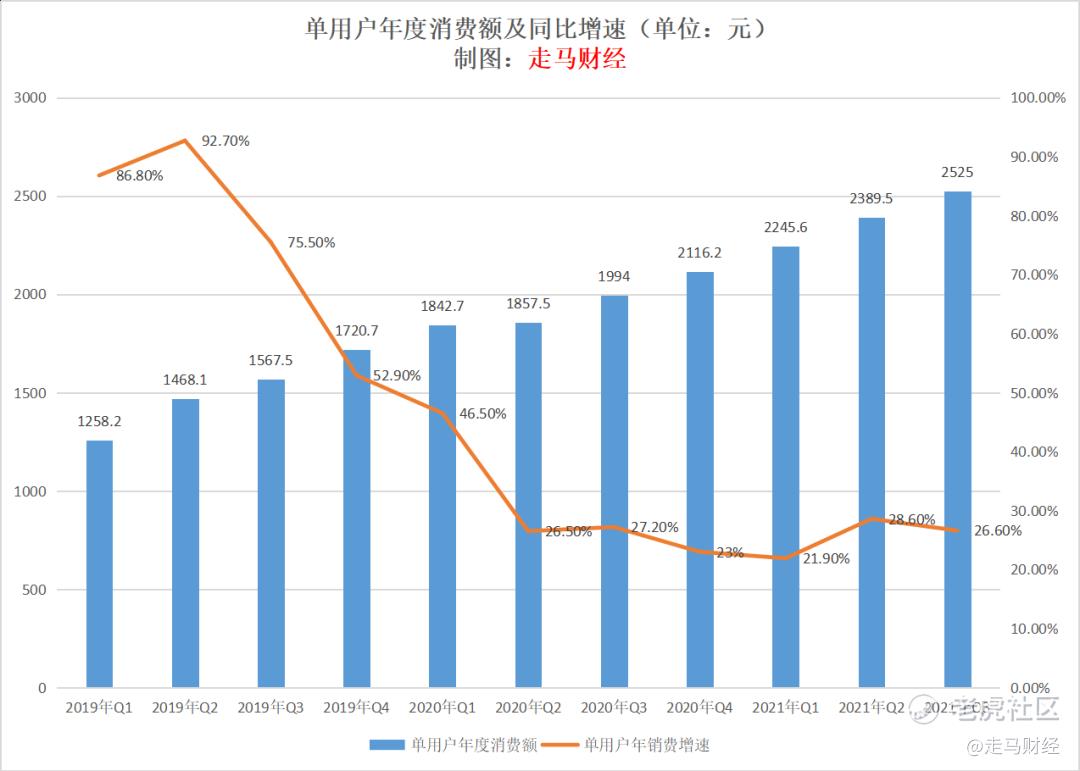 剔除2020年Q1疫情影响,及2021年Q1因为上一年低基数的影响外,2020年前的各个季度GMV高速增长是用户数和单用户消费金额双双高速增长带来的戴维斯双击。