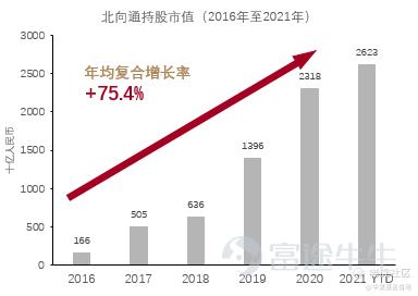 北向通自开通以来规模增长迅速,已成为外资投资中国A股市场的主要工具,2016年至2021年11月30日,年均复合增长率高达75.4%。外资通过北向通持股的市值占比已超过全部外资持股的90%。*