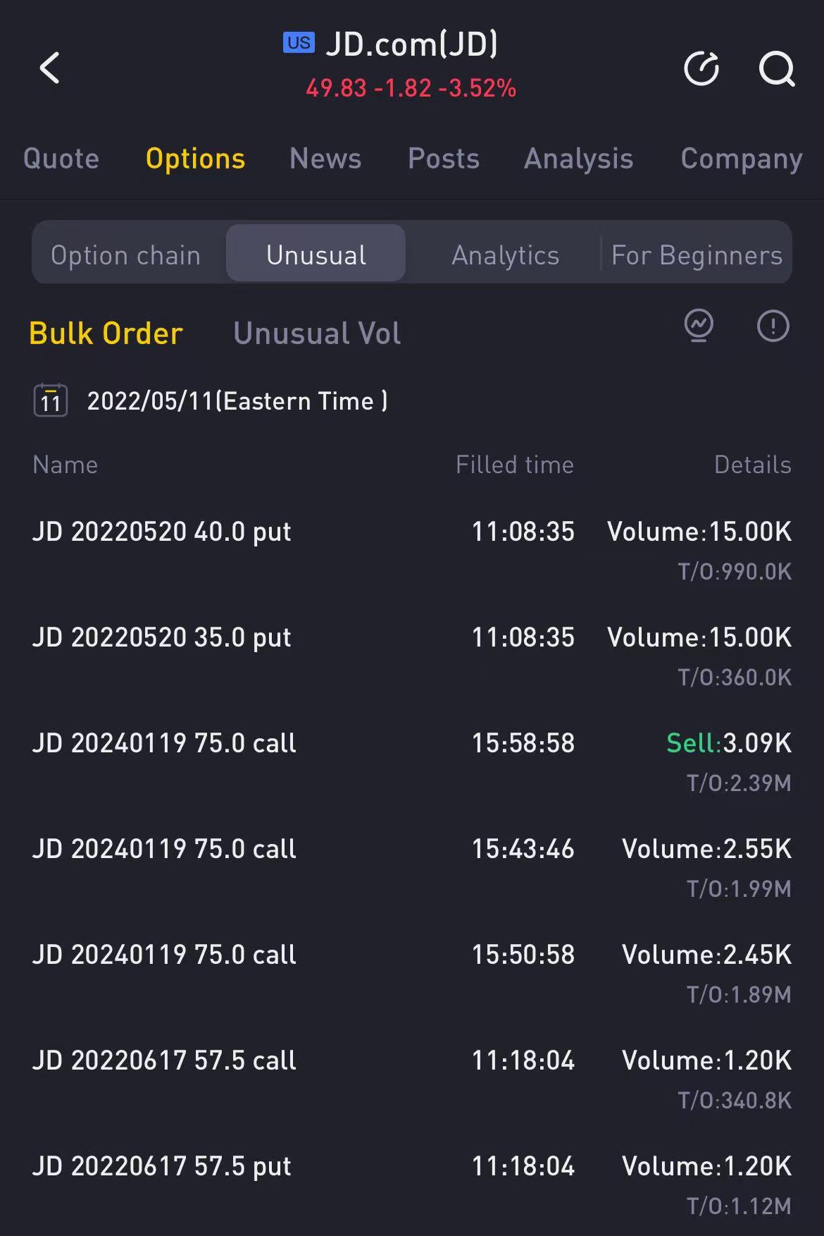 今天在异动榜翻出来的大单是$京东(JD)$ 。京东将于5月17日盘前财报,就近期状况而言可以想象这份财报不会太好看。这张大单做的事put价差,买入行权价40put卖出30put。不过我打算直接做40的这张,然后在财报前平仓$JD 20220520 40.0 PUT$