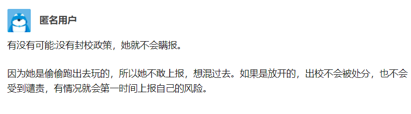 有人说是封校导致了压抑,所以才会偷偷跑出去;还有人说封校也没用,毕竟,王某已经证明了,封校还是会跑出去。