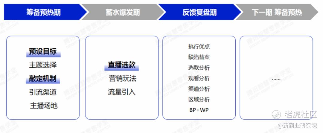 然后是从时间维度明确直播的规划,一般分为三部分:两到三周的筹备预热期、一周左右的蓄水爆发期、三到五天的反馈复盘期。