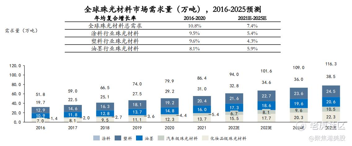 近几年珠光材料的应用和需求数量都呈现出高速增长的态势。2016-2021年均复合增长率达到10.8%,2021年全球珠光材料需求量达到86.4万吨。珠光材料由于具有安全无毒、无污染、色彩明艳等特点,在下游市场具有极高的替代效应,未来市场空间巨大。其中工业级珠光材料需求量占比最大,约占总需求84.0%,合成云母珠光材料的出现极大拓展了珠光材料的在涂料油墨等市场的市场份额。高端市场中,随着珠光材料在汽车行业中的渗透率不断提升,汽车级珠光材料需求量年复合增长率为所有下游市场最高,达到31.6%。化妆品级珠光材料需求量年复合增长率达14.4%,近年美妆行业蓬勃发展有效刺激了珠光材料的需求量。预计2022年至2025年全球珠光材料需求量依然将保持增长趋势,2025年全球总需求量将达到约116.3万吨。潜在的替代效应和渗透率的提升将让珠光材料市场在未来依然保持乐观前景。