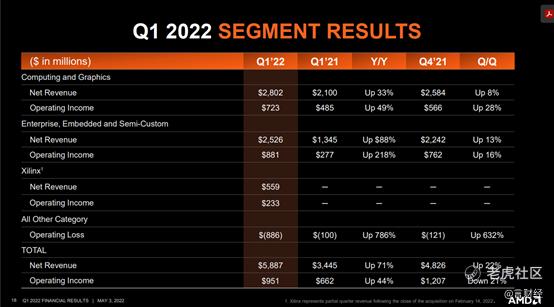 首先看到AMD的业绩情况,AMD这个季度的业绩看成优秀,收入整体增长了71%,营业利润增长了44%,毛利率同比还增长了660bps,营业利润率提升了900bps。收入大涨同时利润率也随之大涨,结果就是净利润同比增长了148%,EPS同比增长了117%。