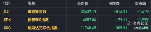 截至收盘,道琼斯指数涨1.61%,报32637.19点;纳斯达克指数涨2.68%,报11740.65点;标普500指数涨1.99%,报4057.84点。