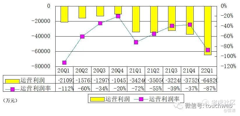 知乎2022年第一季度运营亏损为6.482亿元(约1.023亿美元),2021年同期运营亏损为3.425亿元。知乎2022年第一季度运营利润率为-87%。