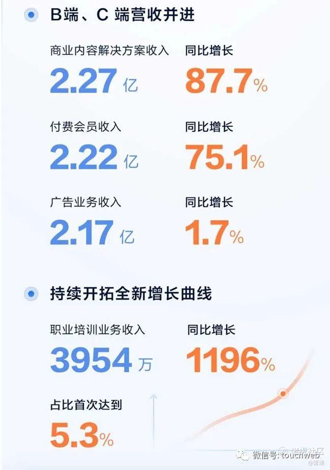 知乎2022年第一季度职业教育业务异军突起,收入占比达到5.3%。其他收入为3790万元。