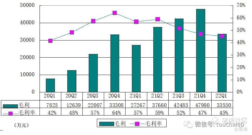 知乎2022年第一季度毛利润为3.355亿元,2021年同期毛利润为2.727亿元。知乎2022年第一季度毛利率为45.1%,而2021年同期为57.0%。