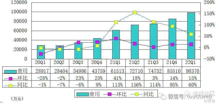 知乎2022年第一季度销售和营销费用为5.066亿元,2021年同期为3.466亿元;研发费用为1.665亿元(约2630万美元),2021年同期为1.063亿元;总务和行政费用为3.106亿元,2021年同期为1.622亿元。