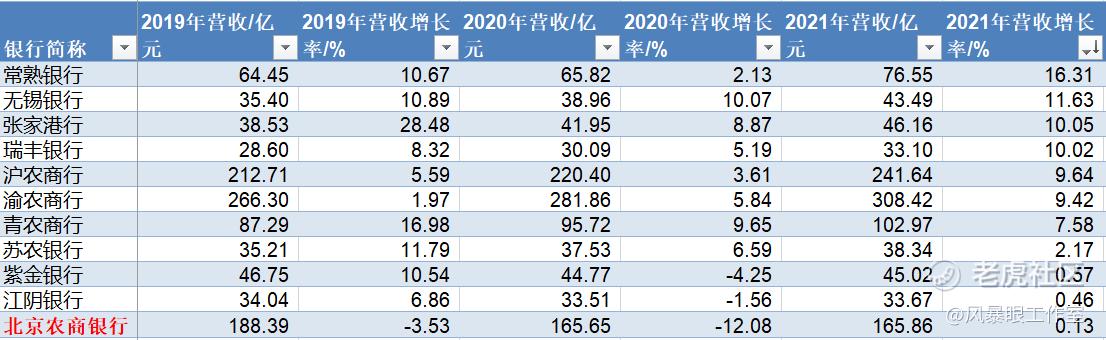 2019年-2021年三年期间,与10家A股农商行相比,北京农商银行营收增速连续三年垫底。