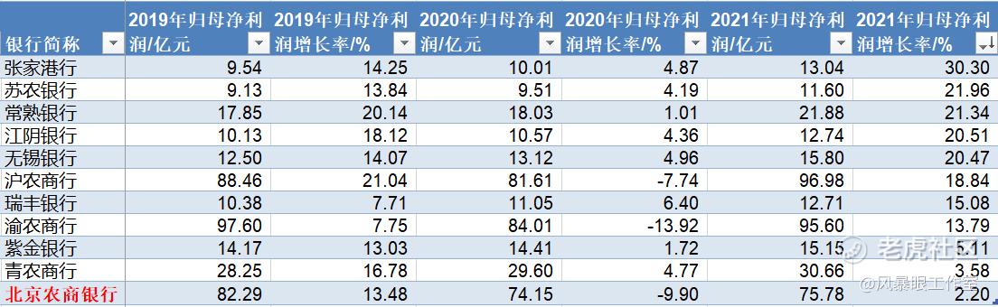 2019年-2021年三年期间,与10家A股农商行相比,北京农商银行的归母净利润增速分别位列倒数第四、倒数第二、倒数第一。