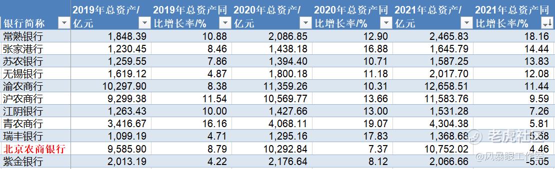 据Wind数据,北京农商银行2019年、2020年、2021年总资产分别为9585亿、10292亿、10752亿,总资产增速分别为8.79%、7.37%、4.46%。