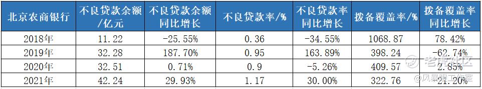 北京农商银行2018年不良率为0.36%,2021年不良率为1.17%,四年整体增幅达225%,其中2019年单年大增163%,2021年大增30%。
