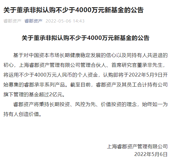 睿郡资产公告称,基于对中国资本市场长期健康稳定发展的信心以及同持有人共进退的初心,上海睿郡资产管理有限公司管理合伙人、首席研究官董承非先生,将运用不少于4000万元人民币的个人资金,认购即将于2022年5月9日开始募集的睿郡承非系列产品。
