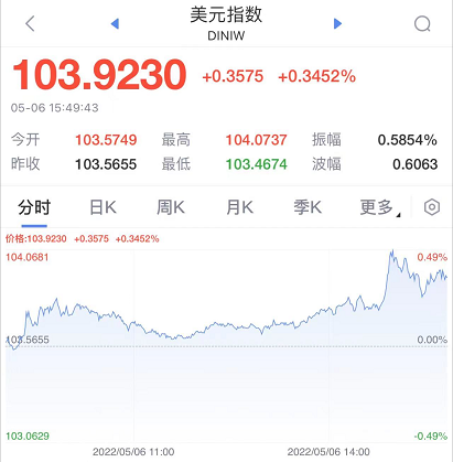 5月6日周五,美元指数站上104,为2002年12月以来首次。