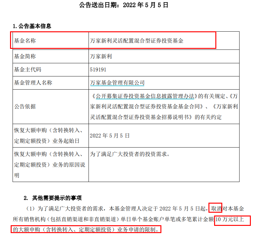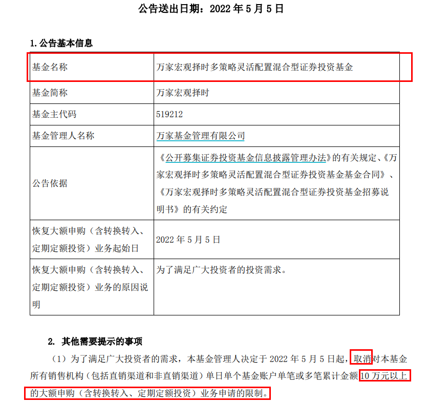 根据公告,自5月5日起,万家基金取消对万家宏观择时多策略、万家新利灵活配置两只基金所有销售机构单日单个基金账户单笔或多笔累计金额10万元以上的大额申购(含转换转入、定期定额投资)业务申请的限制。