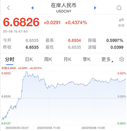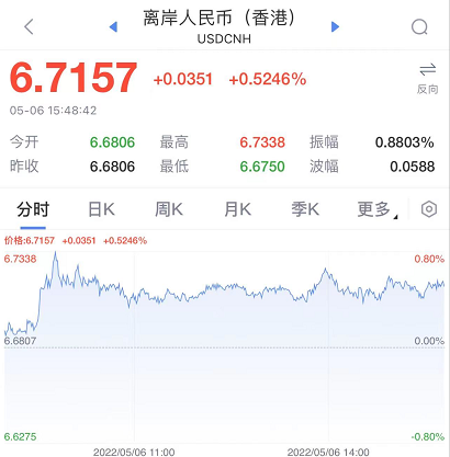 5月6日,离岸人民币兑美元盘中最低触及6.73,贬值势头仍在继续。