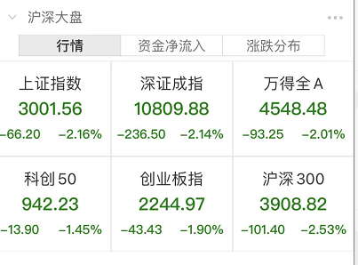 今天的股市,大家看到了,三大股指大幅低开,盘中弱势震荡下探。沪指跌逾2%一度失守3000点大关,截至收盘,沪指跌2.16%报3001.56点,深成指跌2.14%报10809.88点,创业板指跌1.9%报2244.97点;两市合计成交7598亿元。