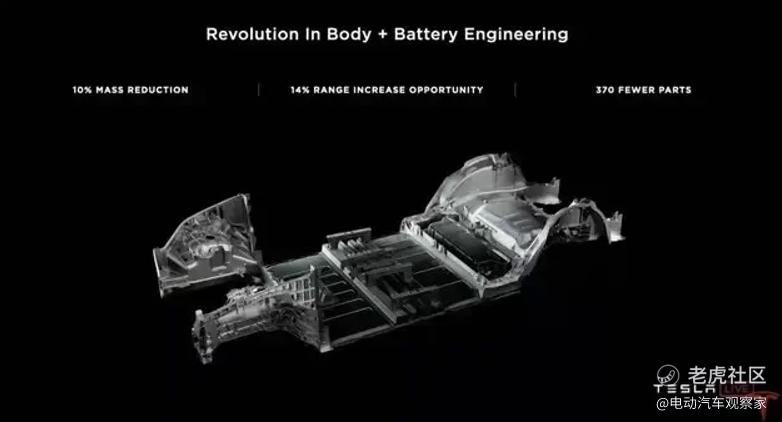 新结构拥有很高的结构强度,且电芯布置得更集中,降低了车辆的转动惯量,更有利于操控和转向响应。三者结合实现了10%的轻量化,14%的续航提升潜力。更为难得的是,该结构减少了370个车身零部件,生产制造环节大幅削减,致使上百个工业机器人下岗。