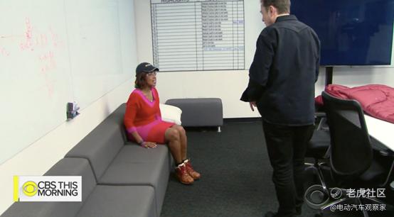 在CBS一档节目中,马斯克向记者展示他睡觉的沙发。这个沙发太窄,有时马斯克索性睡在地上。图右桌上的就是他的睡袋。