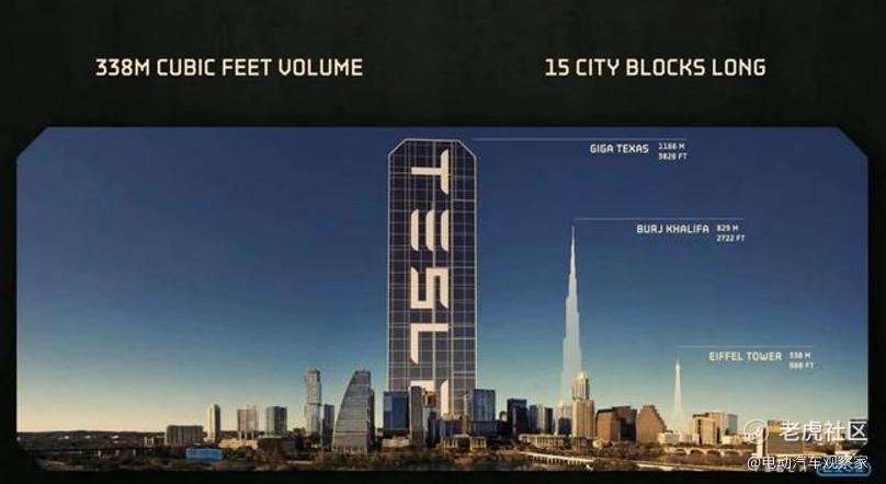 马斯克提到说,德州工厂是全世界最大的单体建筑,大到可以容纳 1940 亿只仓鼠。如果将工厂立起来,它比迪拜塔还要高(迪拜哈利法塔高828米)。