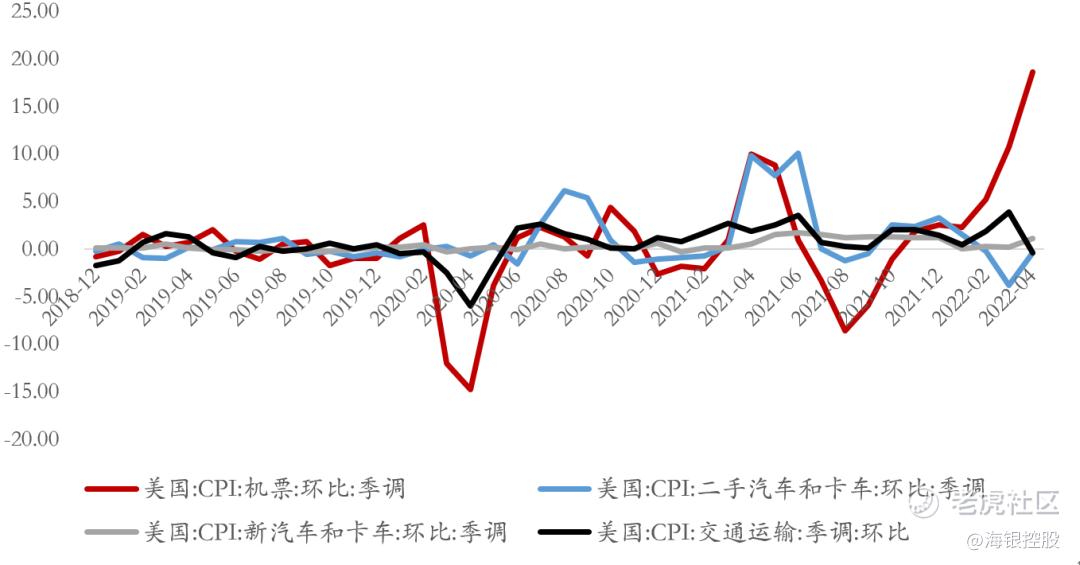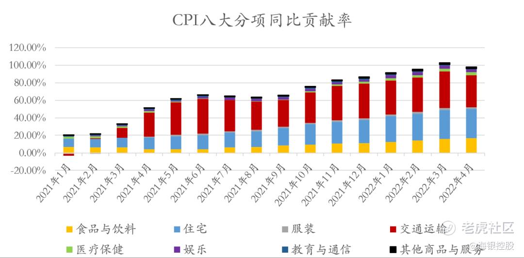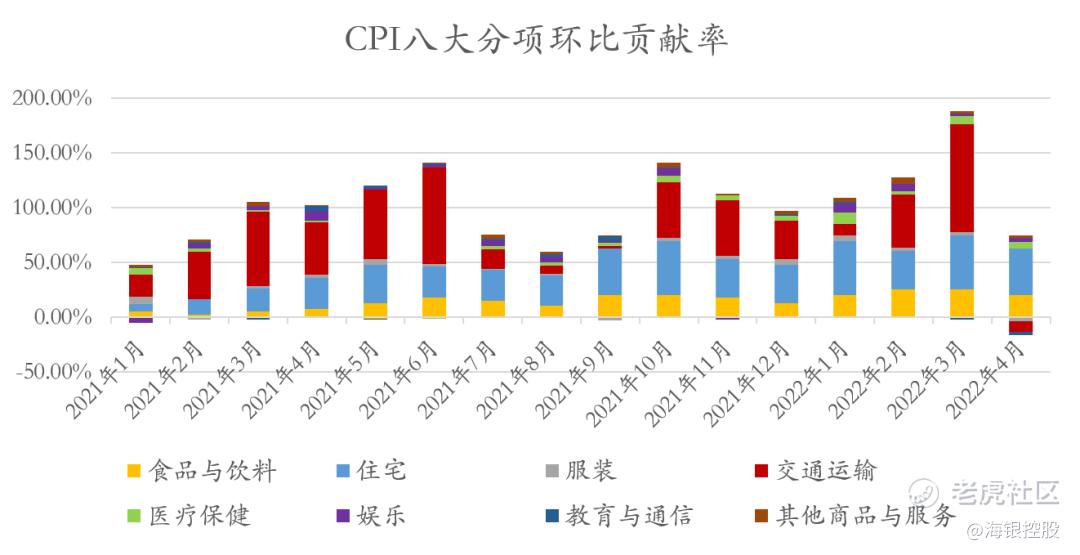 涨幅主要由住宅、食品、交通运输所贡献,原油价格有所降温。按美国CPI八大一级分项法来看,就同比贡献率而言,主要由交通运输项、住宅项和食品饮料所贡献。就季调环比贡献率而言,住宅、食品饮料、医疗保健为主要拉动项。