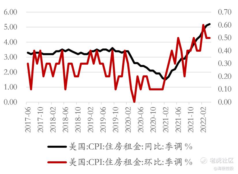 租金作为核心服务的分项,受需求影响仍将保持上行,短期通胀也很难有所降温。美联储加息以来,30年期抵押贷款利率已经从2020年12月24的2.66%升至2022年5月19日的5.3%,每月贷款成本的增加导致部分购房者转而考虑租房,叠加疫情常态化后美国人回归办公室带来的租房需求增加,进一步推升住房租金上涨。2022年4月住房租金环比增速维持0.5%,同比升至5.2%,考虑到未来更多的劳动力回归和加息周期下房贷利率的持续上行,年内住房租金的增长态势或难以转变。