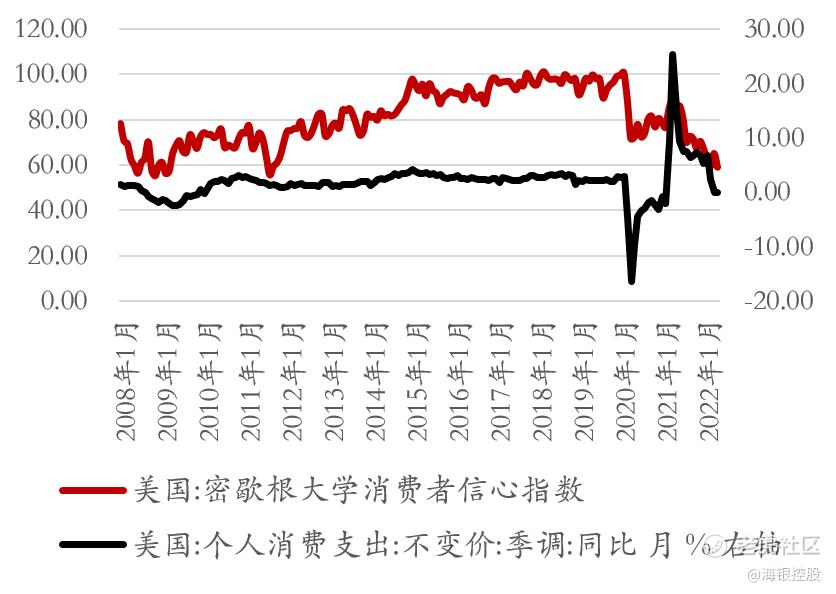 但需警惕在通胀高企和美联储激进加息背景下,短期消费对经济的拉动作用可能会放缓。受到物价上涨影响,去年下半年以来美国居民消费信心和消费支出增速均保持下行趋势。此外,由于美国居民采取贷款消费的模式,而美联储加息会导致消费贷款利率明显抬升,也会抑制消费意愿。