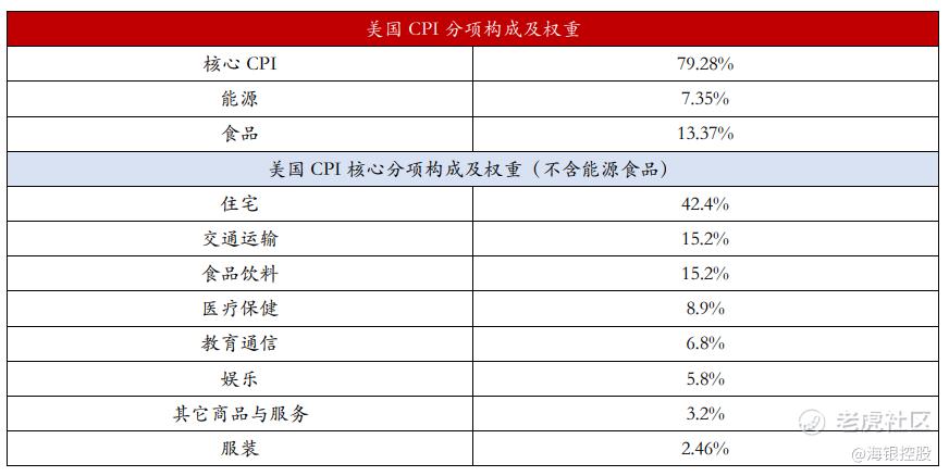 图表 3 美国CPI分项及美国CPI核心分项构成及权重