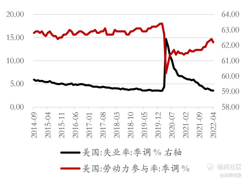 内部供给层面,劳动力短缺问题依旧严重,现有劳动力供给仍不能满足需求。就业市场的供给缺口,一般可以分为两种可能:劳动力参与率的下降 (居民不想找工作而退出劳动力市场)和失业人口的增加(居民想找工作但是因为种种原因暂时失业),而此次导致供给缺口的是前者。主要原因在于美国财政刺激使得劳动力返工意愿不强,因此仍有很多人选择退出劳动力市场。从目前数据来说,失业率不断下降(4月为3.6%,接近疫情前水平),显示愿意找工作的居民就业率提高。但从劳动参与率来看,4月劳动参与率由升转降至62.2%,为2021年9月以来的首次下降,与疫情前相比仍存在缺口,且短期修复较慢,劳动力供给问题缓解仍需时间。