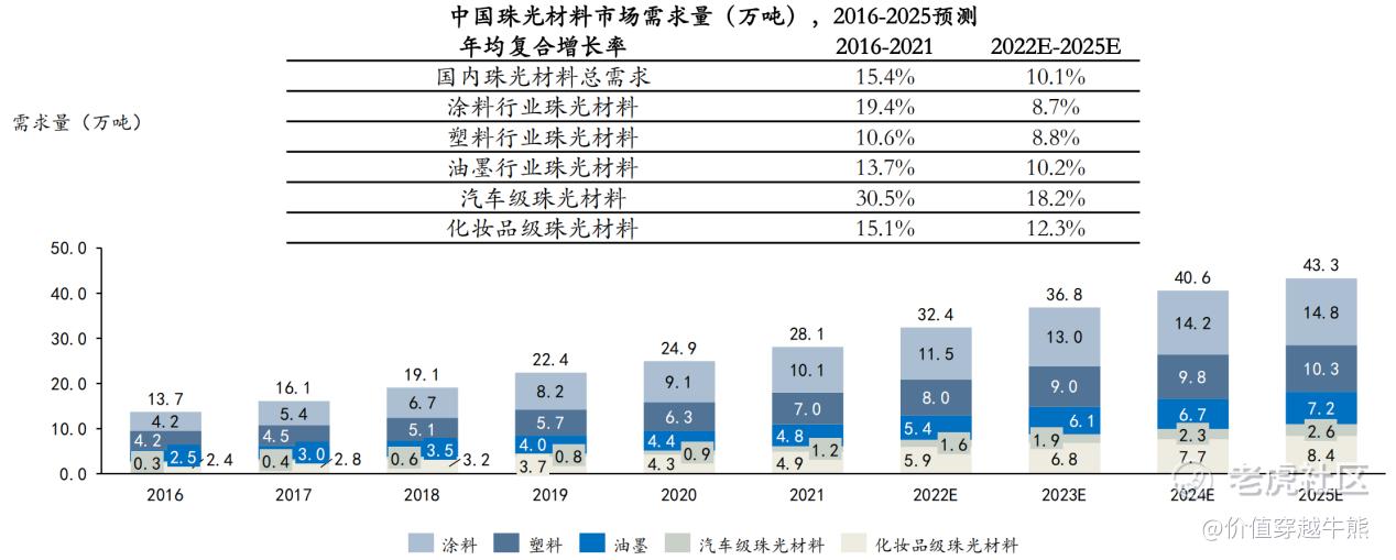 $环球新材国际(06616)$ 作为国内珠光颜料的龙头企业,其生产的珠光颜料产品被广泛用于工业及非工业领域。天然云母基珠光颜料产品目前是珠光颜料行业的主要产品,但是合成云母基珠光颜料市场表现出更加快速发展的状态。根据财报显示环球新材国际合成云母基珠光颜料产品的市场份额从2016年的5.3%增加2021年的12.7%,预计2025年将增加到18.9%。2021年,环球新材国际的珠光颜料产品继续被广泛用于下游应用,且公司产品销往中国及其他多个国家,大规模的销售及营销系统使环球新材国际的产品能够销售给全球知名的化妆品公司、汽车涂料公司、印刷公司及塑料公司。近年来,汽车级珠光材料市场受益于全球汽车产量及保有量稳步增长,珠光材料在汽车领域的渗透率在不断提升,推动汽车级珠光材料市场规模不断扩大。另外,在化妆品领域,随着收入提高和消费升级,人们对外在形象的认识与要求不断提高,推动全球化妆品行业的持续增长,因此带动化妆品级珠光材料市场规模稳定增长。未来,应用于汽车和化妆品领域的珠光材料将在全球珠光材料市场中占有越来越高的比重。