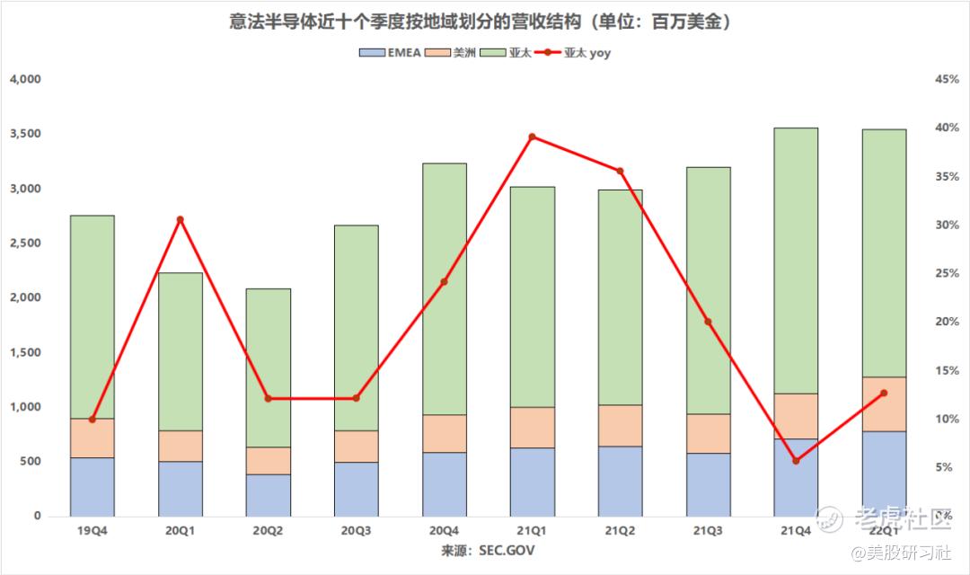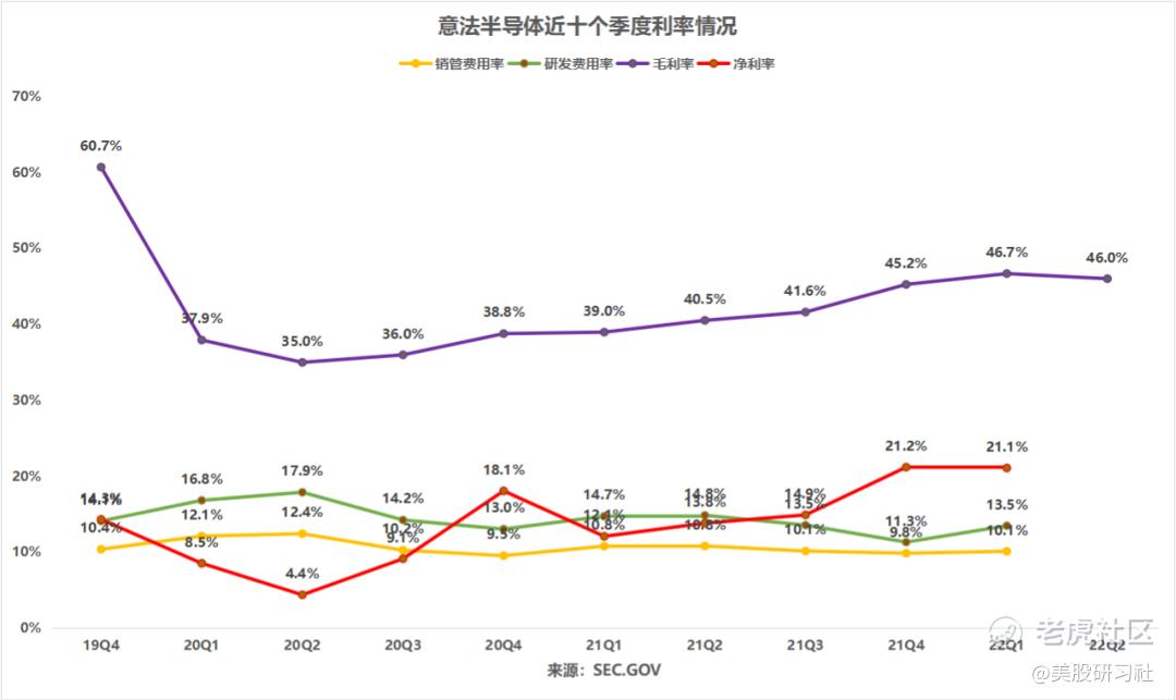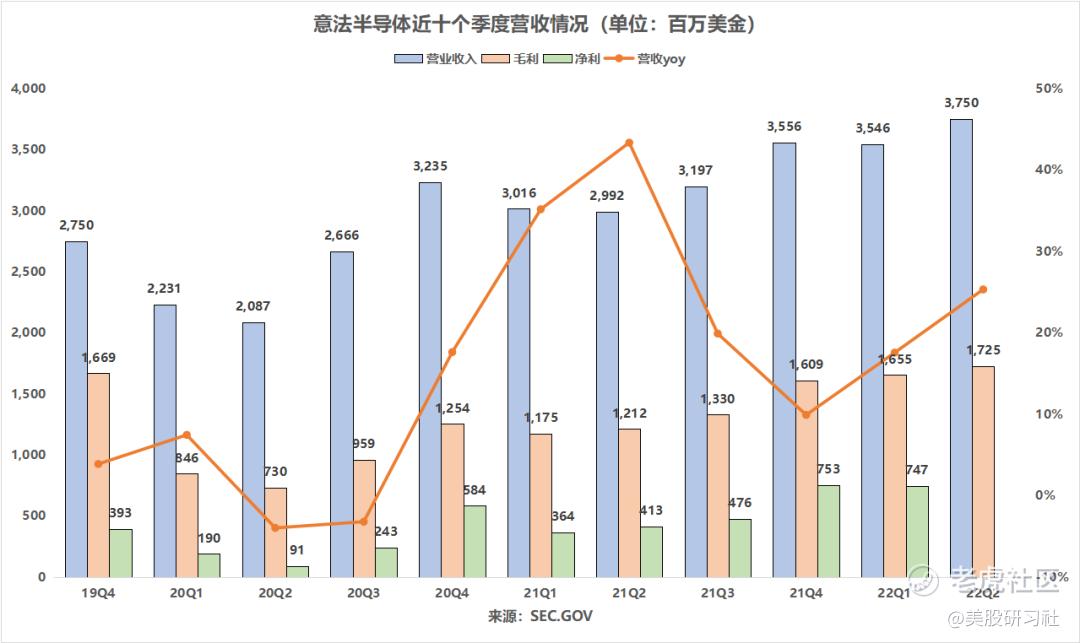 管理层指引:预计Q2净营收中值为37.5亿美元(±3.5%,囊括上海疫情、供应链紧张的影响,以及4月初工厂停电造成法国Crolles的减产),同比增长25.3%,环比增长5.8%;预计毛利率约为46%(±2%)。