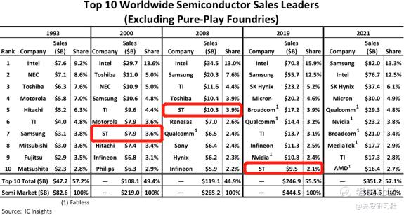 前十大全球半导体销售领导者(不包括纯代工厂)营收情况