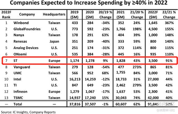 预测2022年资本开支增速大于或等于40%的半导体公司