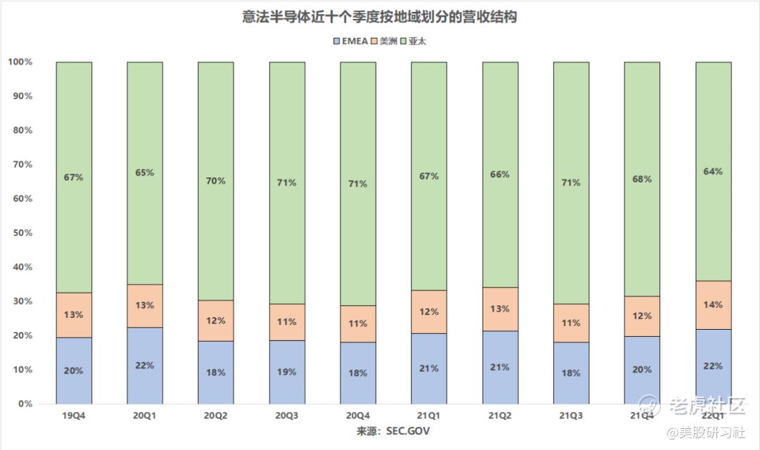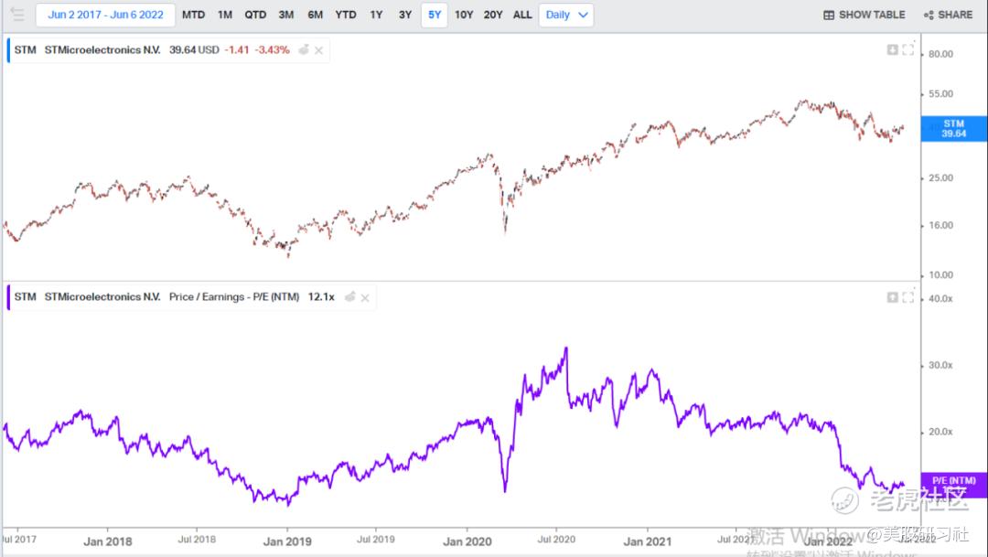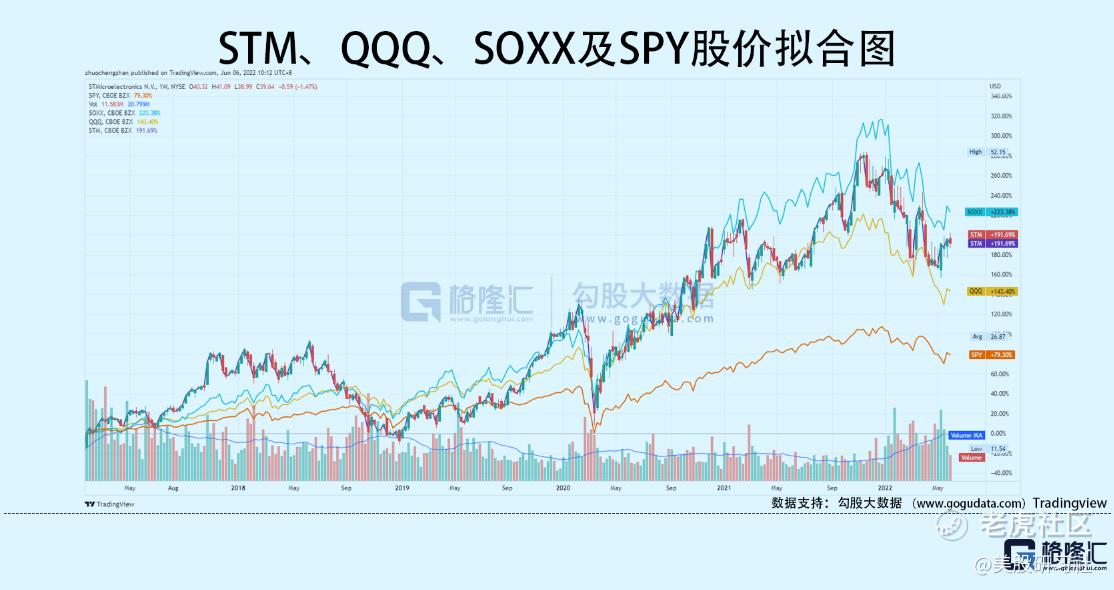 截止22年6月3日收盘,意法半导体21年全年涨幅为29.16%,22年至今涨幅为-17.3%,跑输同期标普500指数ETF(SPY:-12.3%),跑赢同期费城半导体指数(SOXX:-21.4%)和纳指100ETF(QQQ:-22.08%)。