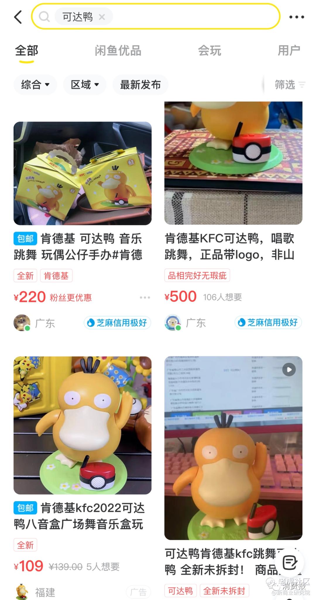 随着可达鸭音乐盒的“一鸭难求”,二手网络平台出现了“代吃”和高价炒作现象。《消费报》在某网络平台上看到,有人发帖子称“肯德基可达鸭代吃,玩具到付,随机出现玩具,没有出不退”,而在该二手网络平台上,仅1个可达鸭音乐盒就可以卖到几百元甚至上千元的价格。