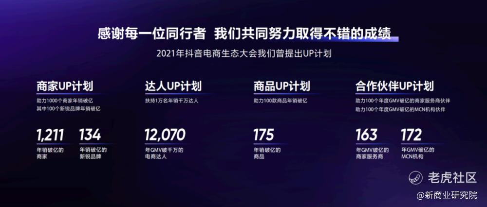 抖音电商数据显示,截止到2022年4月30日,年销破亿的商家有1211个,其中有134个新锐品牌;年GMV破千万的达人超过1.2万名;有163个商家服务商和172个MCN机构的年GMV破亿。