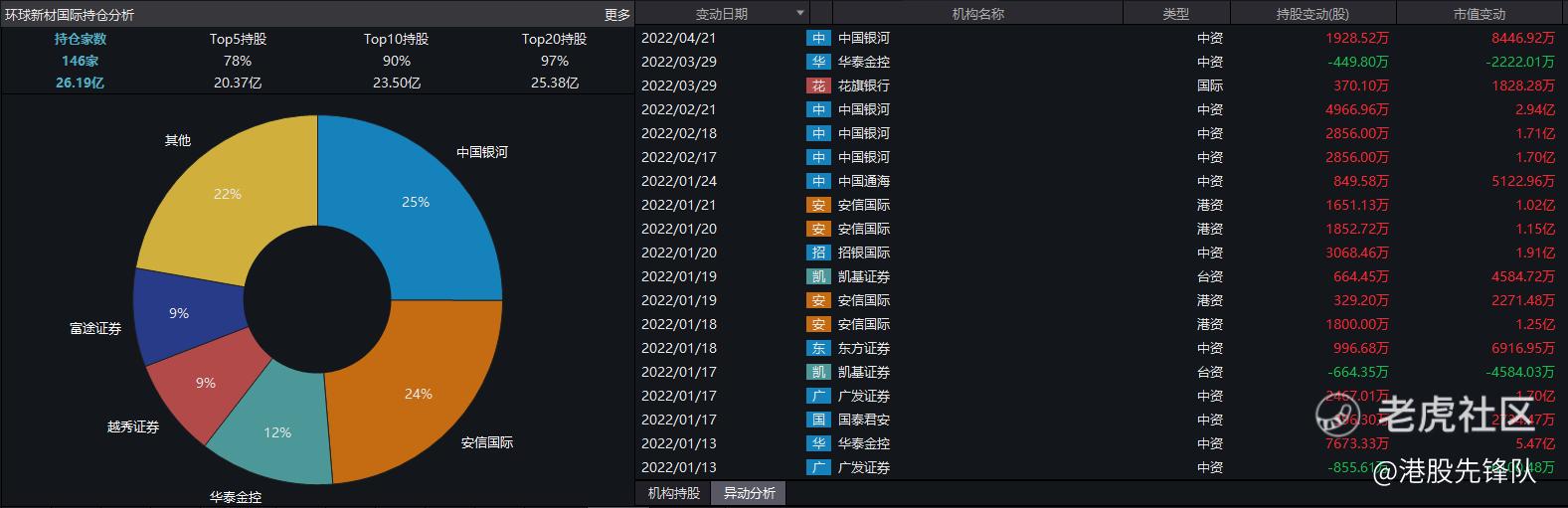 4月21日,中资券商中国银河所持$环球新材国际(06616)$ 股份变动显示,净增1928.52万股,持仓市值增加8446.92万港元,变动占总股数比1.62%。中国银河持仓市值达6.56亿港元,占总市值的12.84%,略超安信国际的12.11%。其实,通过对环球新材国际持仓的简单分析,我们发现前五大机构持股市值达20.37亿港元,占比78%,前十大机构持股市值达23.5亿港元,占比90%,持仓较为集中,尤其是中国银河自2月起便开启了买买买的节奏,截至上周,累计买入超7.15亿港元,排名跃居持仓市值机构第一,这也显示出中资券商对环球新材国际价值的认可与肯定。