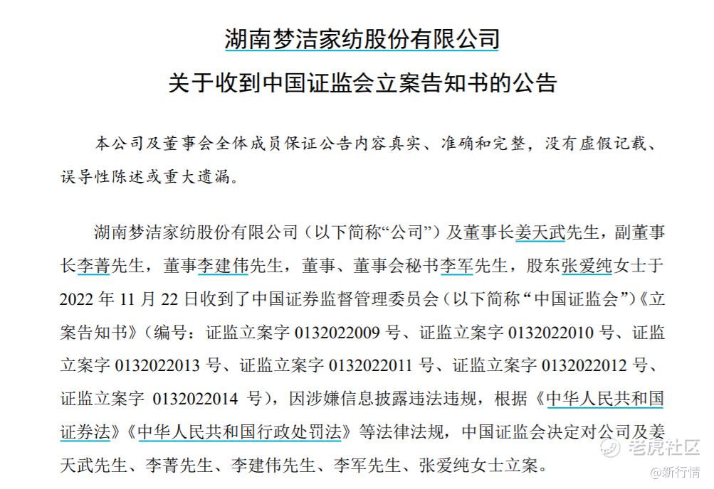 梦洁股份11月23日晚间公告,因涉嫌信息披露违法违规,根据法律法规,中国证监会决定对公司及董事长姜天武,副董事长李菁,董事李建伟,董事、董事会秘书李军,股东张爱纯立案。