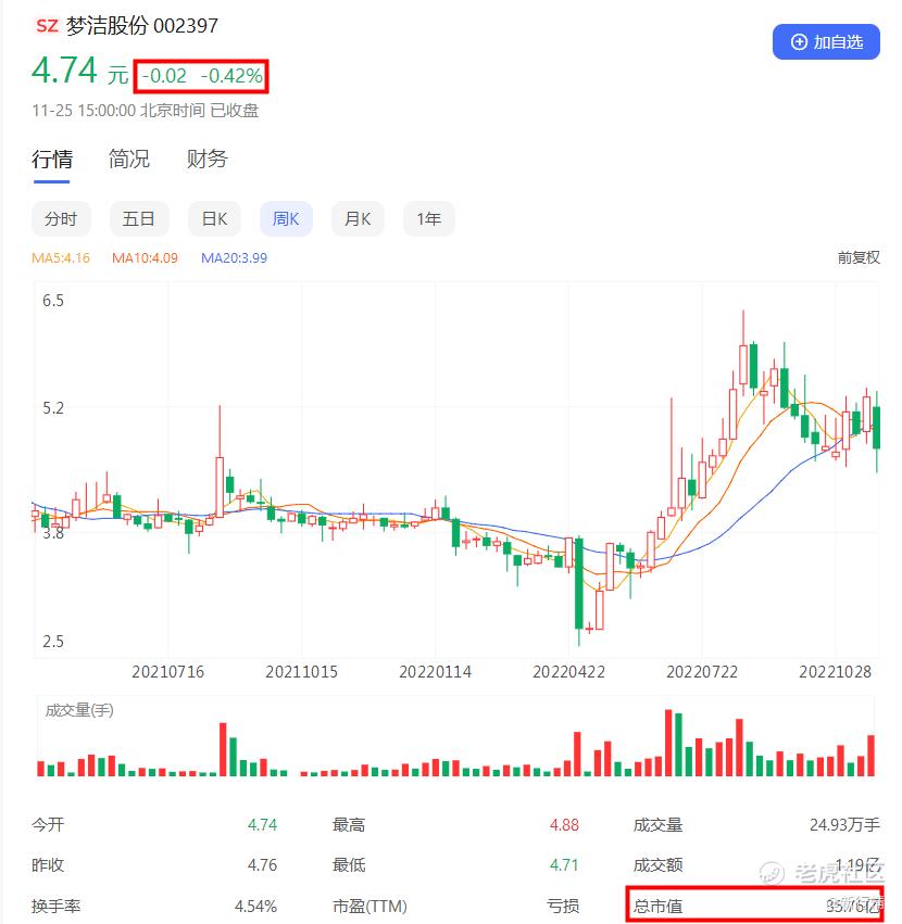 11月24日,梦洁股份早盘以近乎跌停的价格开盘,最终以单日下跌4.03%报收4.76元。截至11月25日收盘,梦洁股份报收4.74元/股,总市值35.76亿元。