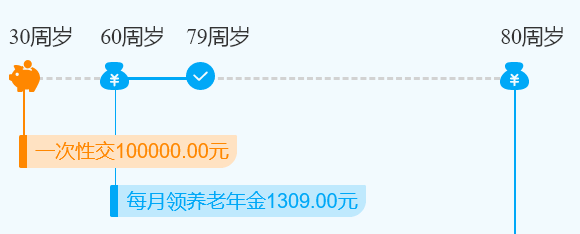 60-79岁,每月领1309元,80岁一次性领15.4万。