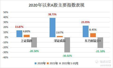 拉长周期来看,近3年的A股市场则是第一年先大幅冲高,第二年则是高位横盘,第三年则是一路下杀,就是倒U型走势。以2020年以来各年的指数表现来粗略的展示近三年(2019.10-2022.10)的市场。可以发现,截至2022年10月31日,上证指数、深证成指几乎是抹平了2020和2021两年的涨幅。